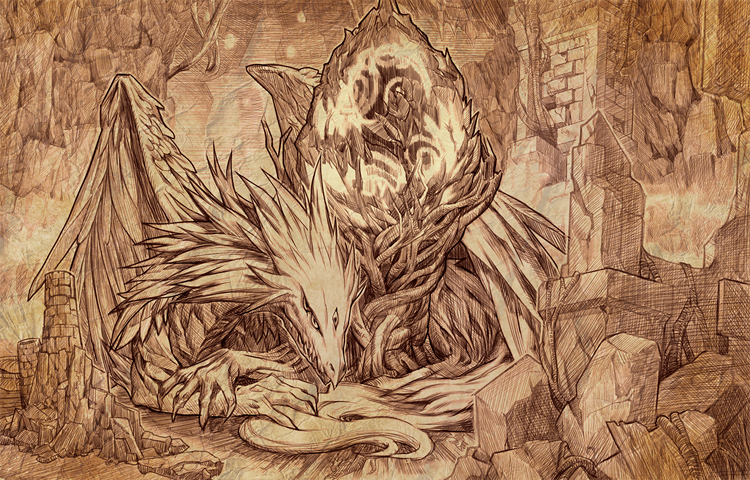 龍に似た巨大な怪物が、宝物を守護する龍のように卵を守っていた。怪物の羽毛は赤く燃え上がるように揺れ、ときおり吐き出す息はまるで溶鉱炉かのような熱気だった。あの怪物がこの辺りの暑さの原因であることは明らかだった。